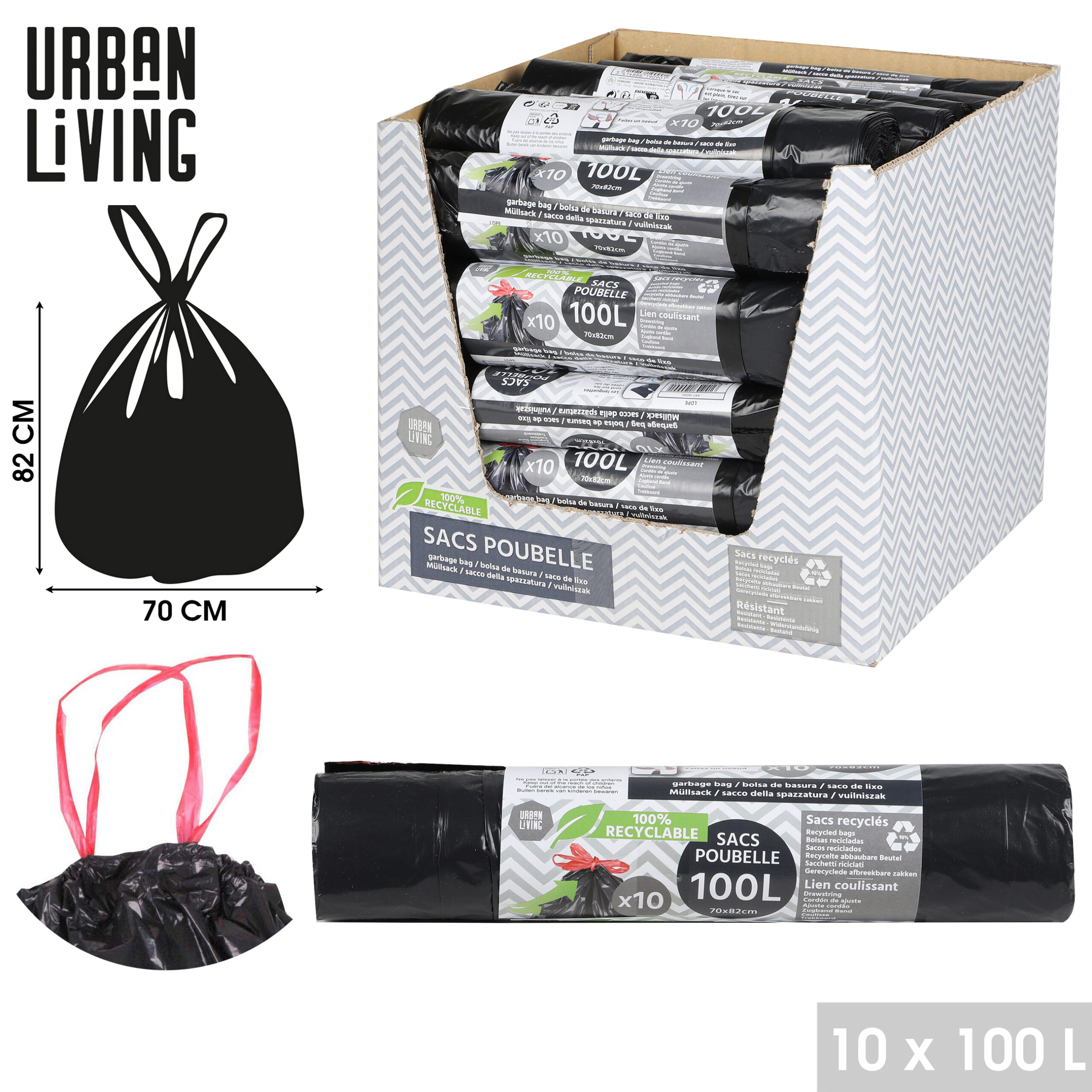 SACS POUBELLE NOIR ECO RECYCLE AVEC LIEN COULISSANT 100LTR X10PCS